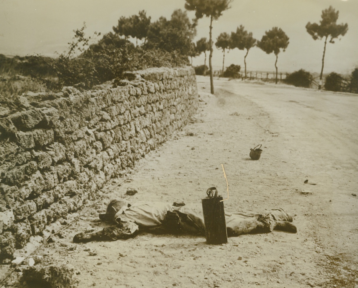 He Didn’t Make It, 9/25/1943. AGROPOLI, ITALY – This Nazi soldier was cut down by American gunners as he was about to vault over this protective wall on the road to Agropoli. The German was laying mines along the road when he was killed. He fell with such force that his helmet landed several feet away. Credit Line (Official Navy Photo from ACME);
