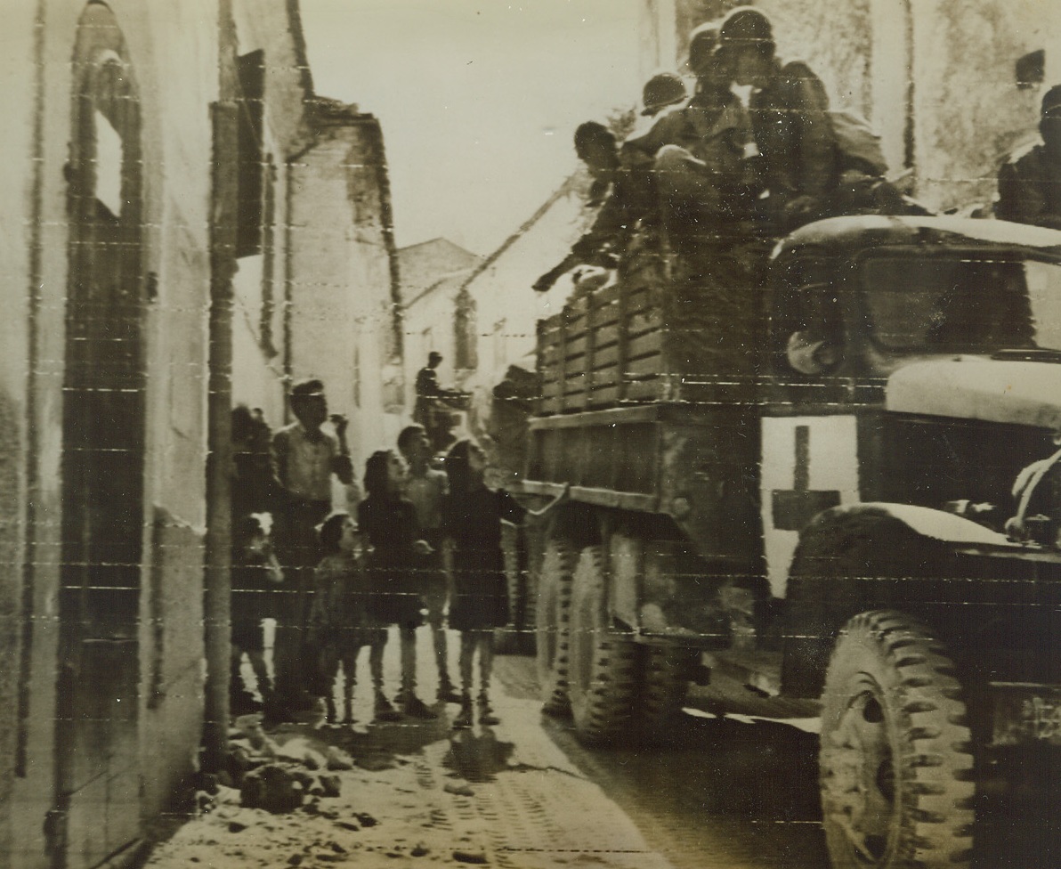 Americans Enter Eboli, 9/25/1943. EBOLI, ITALY – Curious Italian peasants come down to the streets to watch American troops roll through Eboli after occupying that strategic mountain city. Photo, by Acme photographer Charles Corte, was flashed to the U.S. via Radiotelephoto. Credit Line (Signal Corps Radiotelephoto – ACME);