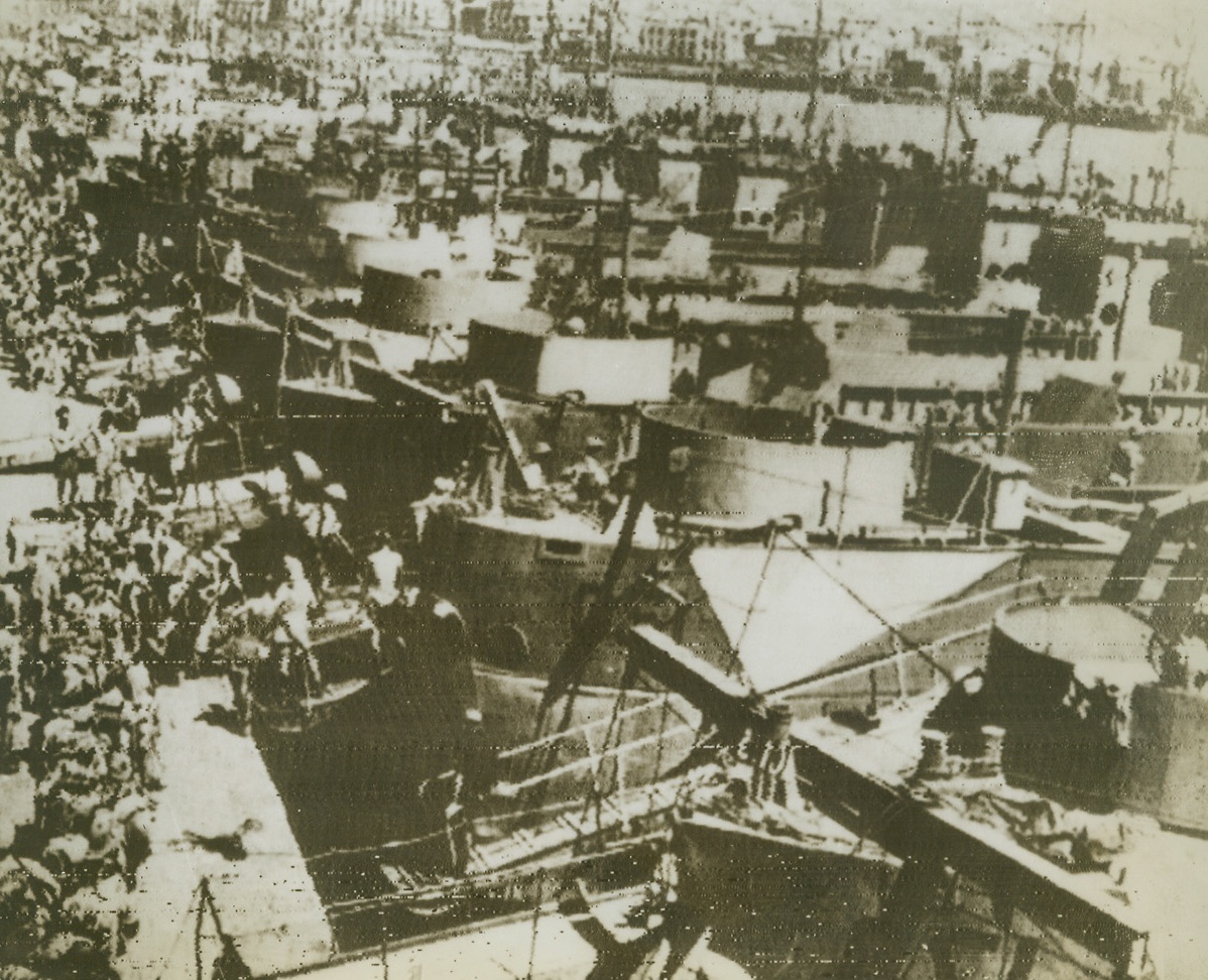 Take-off for Italy, 9/5/1943. SICILY – A Sicilian port is a solid mass of landing boats as the Allies stream on board ready to shove off for Italy. Men, tanks, jeeps and guns were amassed, ready to engulf the Southern tip of Italy under a protective aerial umbrella.Credit (Acme Radiophoto);