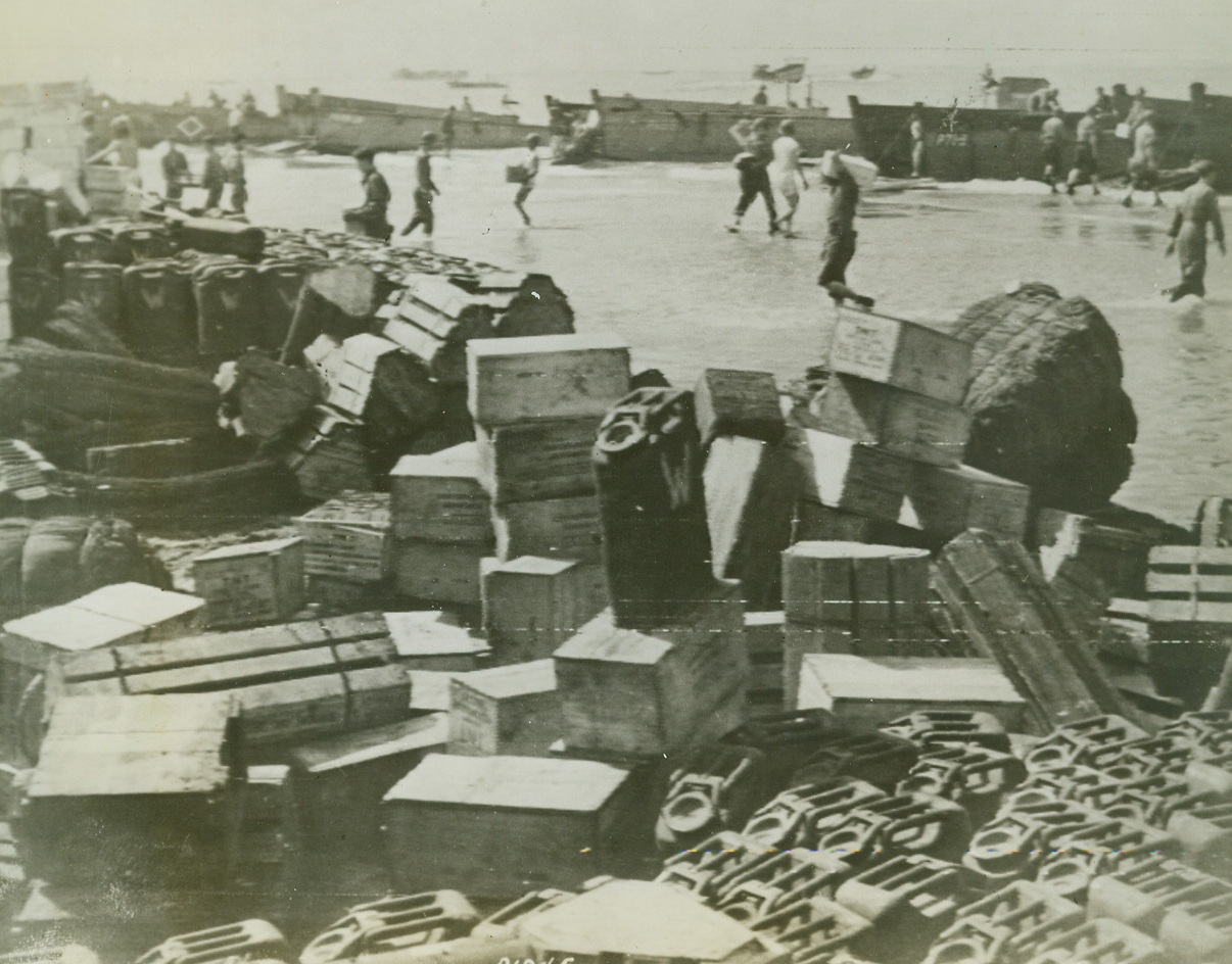 Landing Supplies on Italy’s Shore, 9/13/1943. The above photo flashed to the United States by Radiotelephoto shows – the quick unloading of supplies to keep pace with the fast moving United States troops as they invaded Italy. Under constant strafing and bombing by German planes this important job was extremely hazardous. Credit Line (Acme Photo via US Army Signal Corps Radiotelephoto);