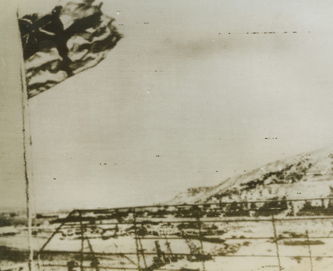 White Ensign Over Italy, 9/6/1943. REGGIO HARBOR, ITALY – The first Allied flag to fly over the Italian mainland, Britain’s white ensign flutters above Reggio harbor. Latest reports indicate that Allied commando raids behind the German lines have resulted in the fall of Melito and Bagnara.Credit Line (Acme Radiophoto);
